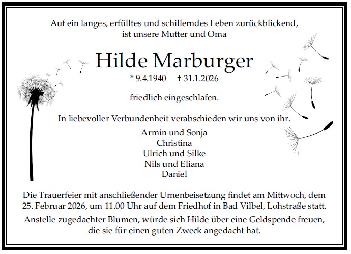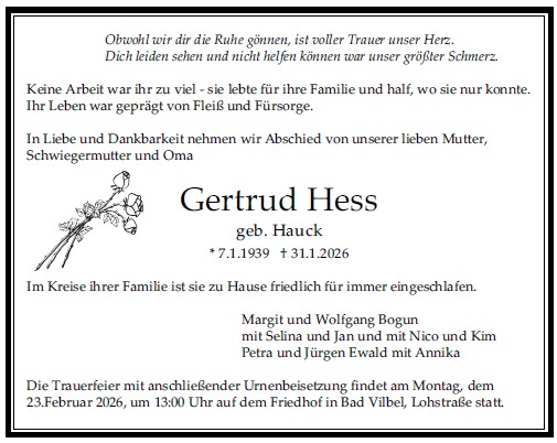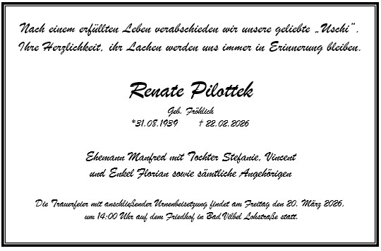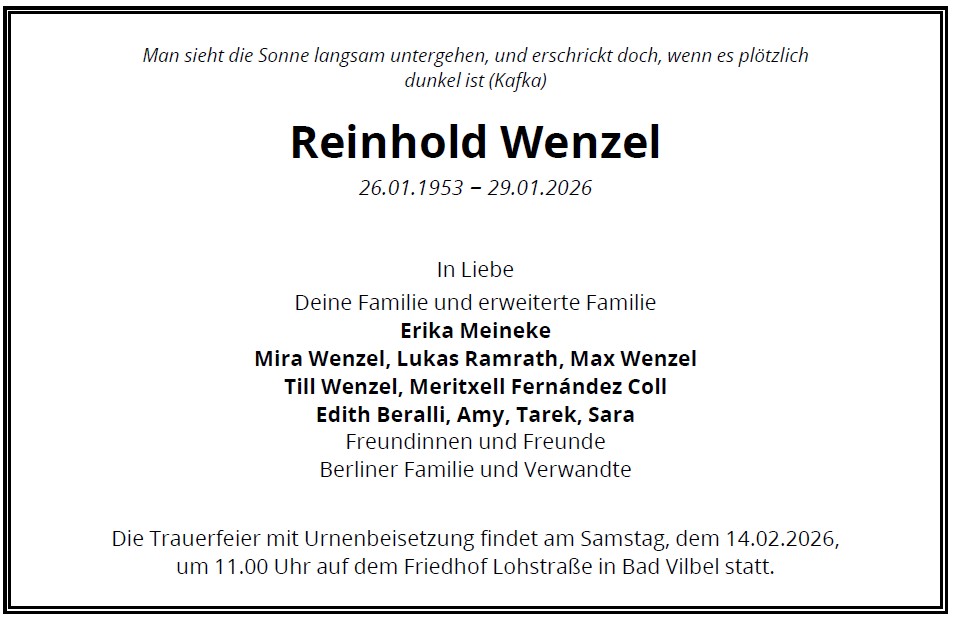 Die Trauerfeier mit anschließender Urnenbeisetzung findet im engsten Familien- und Freundeskreis auf dem Friedhof in Bad Vilbel-Gronau statt.